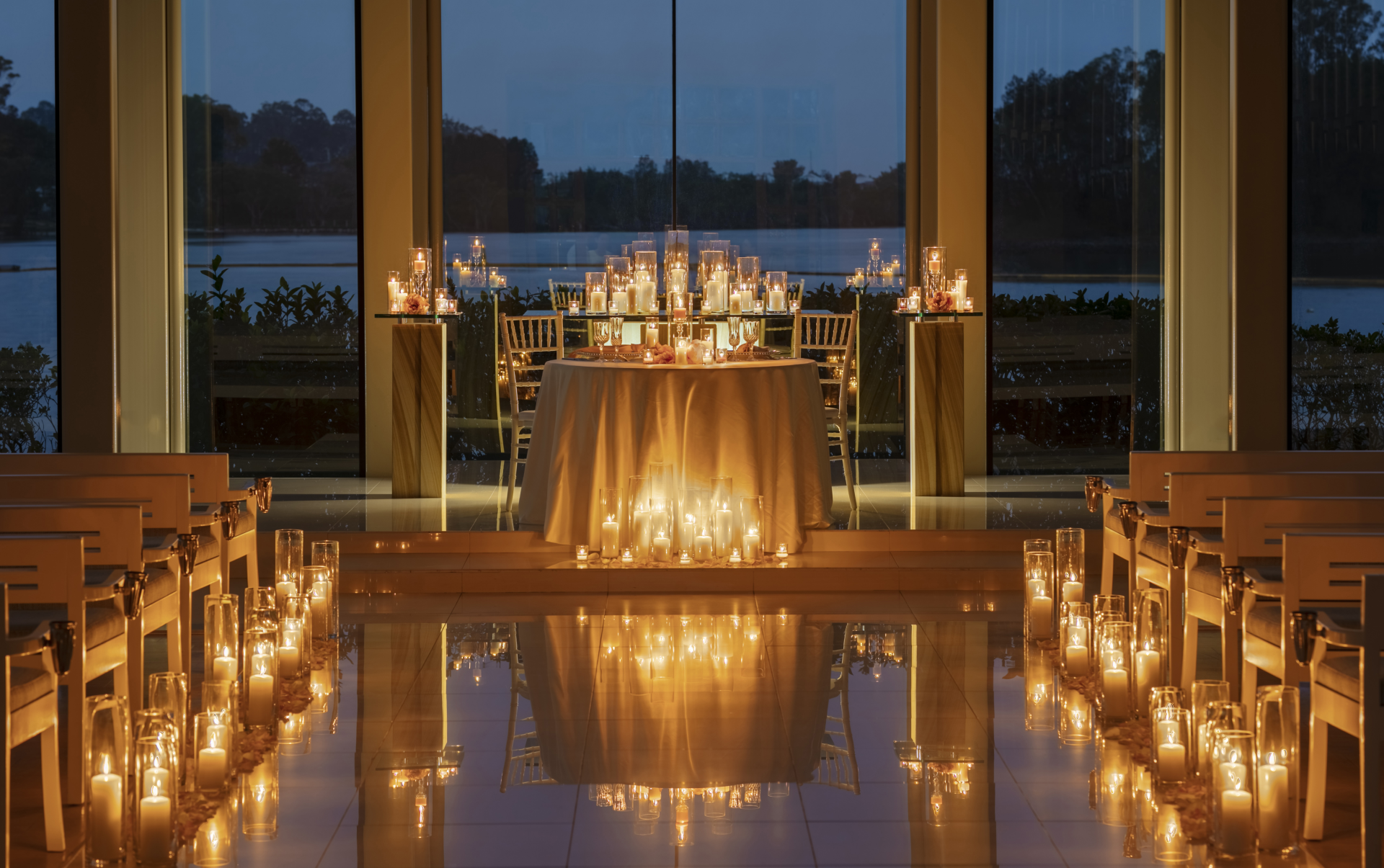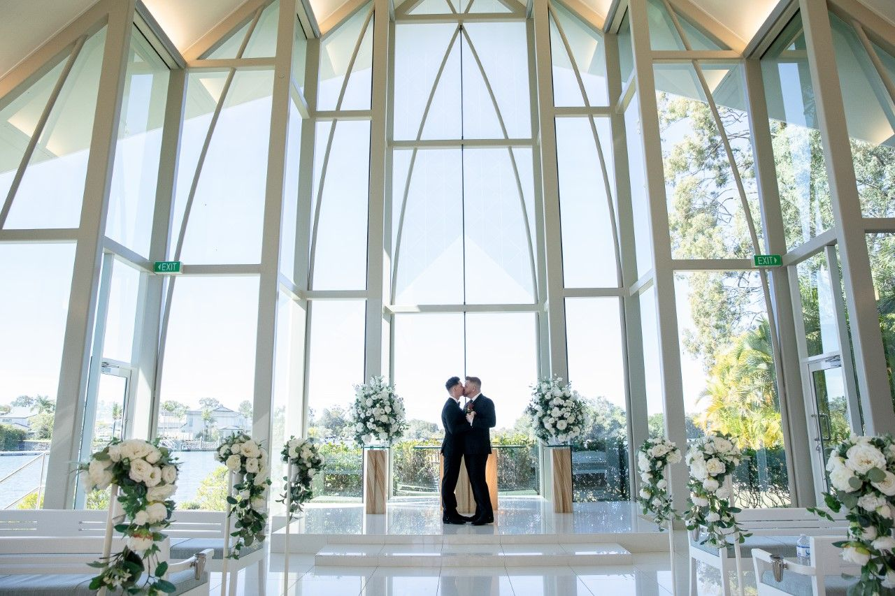 The chapel’s timeless architecture, featuring a floor-to-ceiling glass façade overlooking the picturesque Coomera River, creates the ideal setting for saying “I do.”