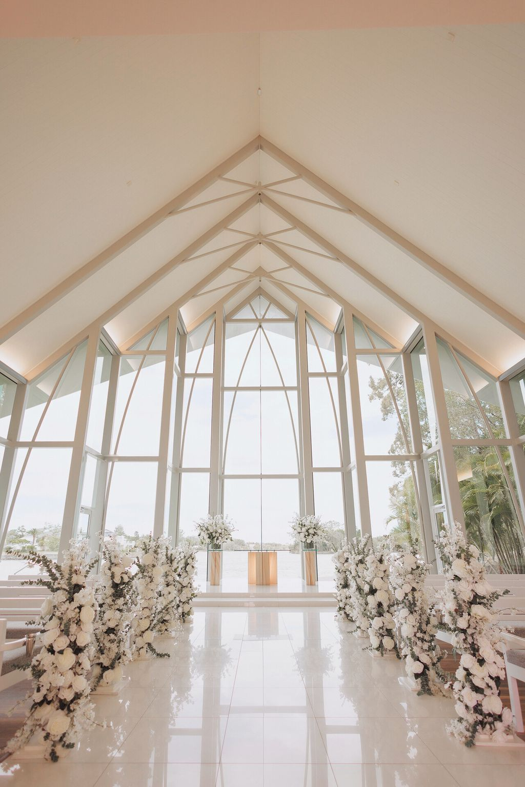 Inside, the chapel boasts sleek contemporary features, including a glass-top registry table centred at the altar, elegant white tiled flooring, and soaring atriums that enhance the sense of space and light. Silk flower arrangements throughout add a touch of natural beauty, complementing the surrounding tropical gardens.